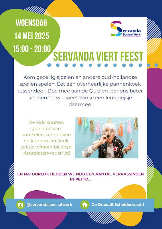 Op woensdag 14 mei a.s. viert Servanda feest. Van 15:00 tot 20:00 uur is iedereen welkom om het feest mee te vieren. Een dag vol informatie en activiteiten in en rond De Ducdalf, Scheldestraat 1.
