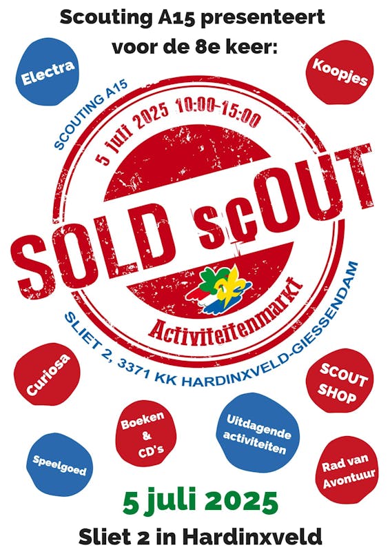 Op zaterdag 5 juli bruist het terrein van Scouting A15 aan de Sliet in Hardinxveld-Giessendam van de energie, want dan vindt de 8ste editie van SoldscOUT plaats. Tussen 10:00 en 15:00 uur zijn bezoekers van harte welkom voor een dag vol gezelligheid, actie en verrassingen.