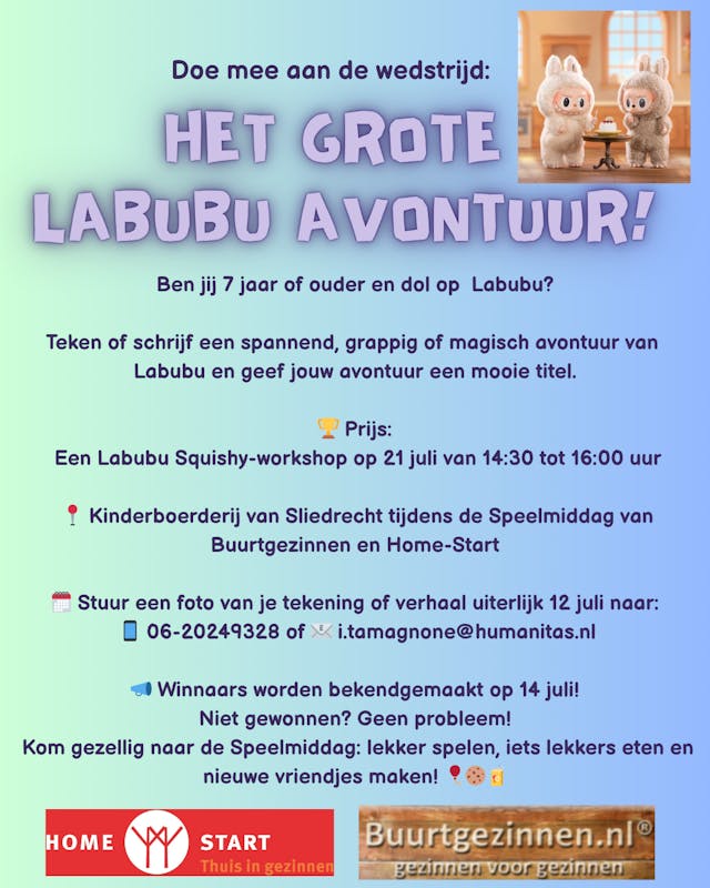 Speciaal voor kinderen vanaf 7 jaar is er een creatieve wedstrijd uitgezet onder de titel Het Grote Labubu Avontuur. Deelnemers worden uitgedaagd om een tekening of kort verhaal te maken over een spannend, grappig of magisch avontuur van het populaire figuurtje Labubu.
