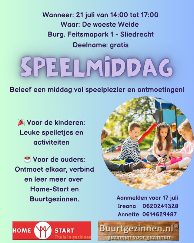 Op maandag 21 juli organiseren Home-Start en Buurtgezinnen een feestelijke speelmiddag voor gezinnen uit Sliedrecht bij kinderboerderij De Woeste Weide. Het evenement is gratis toegankelijk en vindt plaats van 14.00 tot 17.00 uur aan de Burgemeester Faitsmapark 1.