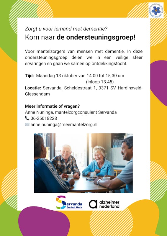Mantelzorger zijn voor iemand met dementie is vaak intensief en emotioneel. Daarom organiseert Servanda i.s.m. Alzheimercafé Hardinxveld een ondersteuningsgroep waar mantelzorgers ervaringen kunnen delen, herkenning vinden en samen nieuwe inzichten opdoen.