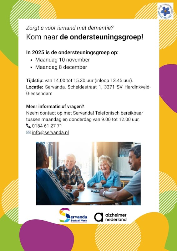 Mantelzorger zijn voor iemand met dementie is vaak intensief en emotioneel. Daarom organiseert Servanda i.s.m. Alzheimercafé Hardinxveld, maandelijks een ondersteuningsgroep waar mantelzorgers ervaringen kunnen delen, herkenning vinden en samen nieuwe inzichten opdoen.