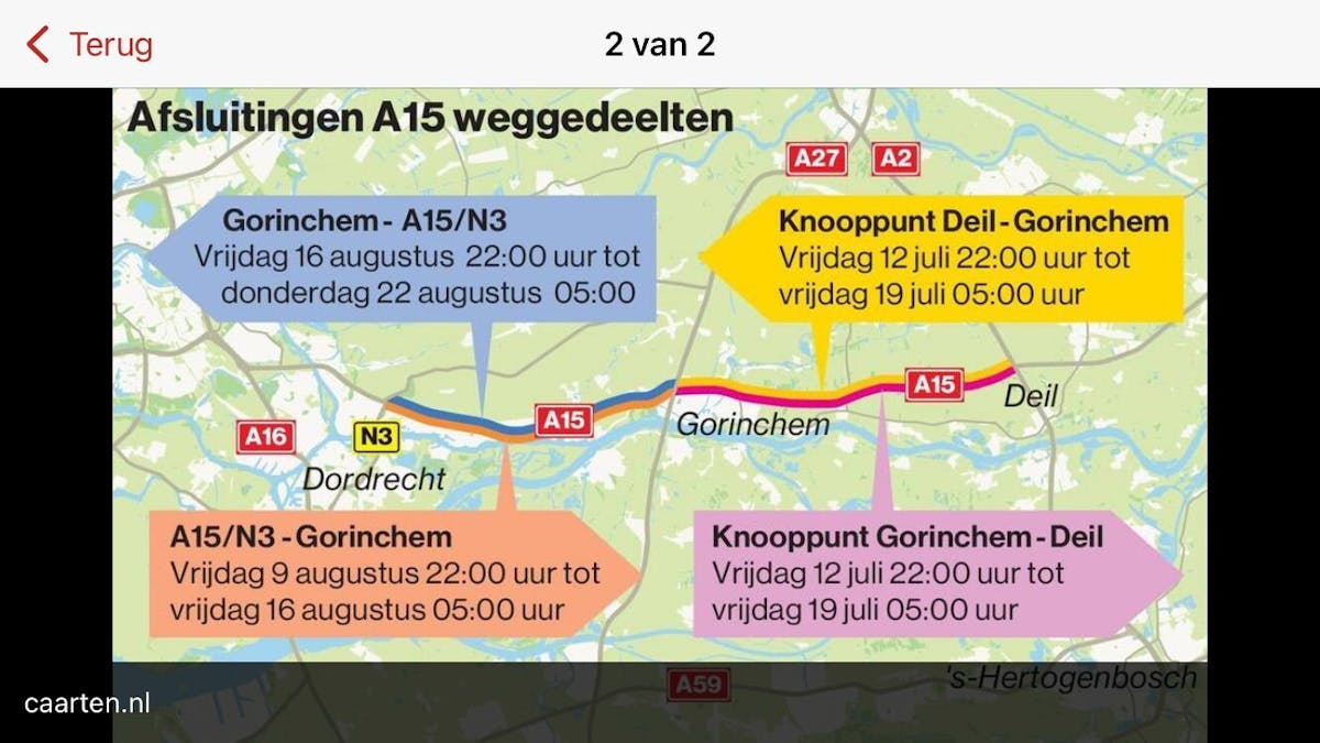 - van vrijdag 9 augustus 22.00 tot vrijdag 16 augustus 05.00 uur: weekafsluiting A15/N3 richting knooppunt Gorinchem;