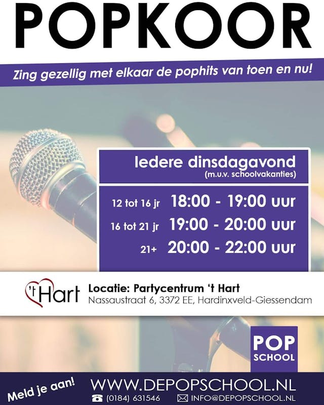 Lijkt het je leuk om te zingen in een koor? Elke dinsdagavond (m.u.v. schoolvakanties) zingt ons Popkoor in Partycentrum 't Hart. Iedereen van harte welkom voor een proefles