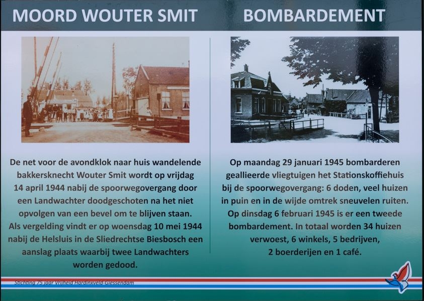 Op de avond van 14 april 1944 loopt de 57-jarige bakkersknecht Wouter Smit bij het station van Giessendam. Hij had een ledenvergadering van het Groene Kruis bezocht en is op weg naar huis. Bij het kruispunt Spoorwegovergang Binnendams bij de spoorwegovergang staan vier landwachters die de opdracht hadden die avond persoonsbewijzen van voorbijgangers te controleren. Als Wouter Smit Binnendams (nu Damstraat) uitloopt en bij het kruispunt aankomt, passeert hij de jeugdige landwachter Joop Westdijk. Omdat Smit, waarschijnlijk in gedachten verzonken, doorloopt, roept deze: “Halt landwacht”. Smit volgt het bevel niet op, waarop hij nogmaals door dezelfde landwachter wordt aangeroepen. Smit hoort het bevel weer niet, wordt daarna vrijwel direct neergeschoten en raakt daarbij levensgevaarlijk gewond in de rug. Wouter Smit wordt het nabijgelegen koffiehuis van W.A. van den Heuvel binnengedragen. Na vergeefse pogingen de bloedende wond te stelpen, wordt al snel duidelijk dat redding niet meer mogelijk is. Als korte tijd later een dokter arriveert, is Wouter Smit al overleden. Op woensdag 19 april wordt bakkersknecht Wouter Smit op de begraafplaats aan de Achterdijk (nu Kerkweg) te Neder-Hardinxveld begraven. Als vergelding voor deze moord vindt er op woensdag 10 mei 1944 nabij de Helsluis in de Sliedrechtse Biesbosch een aanslag plaats waarbij twee Landwachters worden gedood.