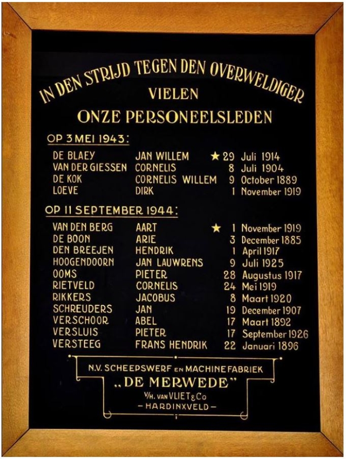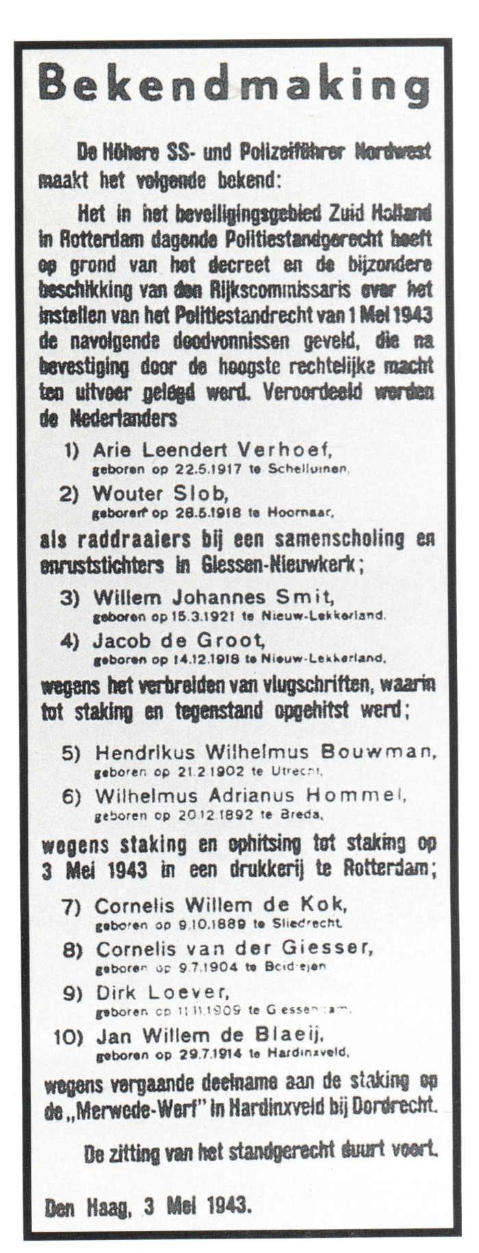 Op 29 april 1943 vermeldden de kranten dat de Duitsers willen dat de voormalige Nederlandse militairen opnieuw in krijgsgevangenschap worden genomen. De oorzaak van dit besluit moet worden gezocht in het feit dat het de Duitsers op veel fronten niet goed gaat. Bovendien is men bang voor een invasie vanuit Engeland. De onverwachte Duitse maatregel leidt tot een evenzo onverwachte reactie van de Nederlandse bevolking: Een reeks van stakingen, die later de geschiedenis zijn ingegaan als de 'april-mei stakingen van 1943'. De stakingen beginnen bij Machinefabriek Stork in Hengelo, waar 3.000 werknemers weglopen. Veel andere bedrijven in het land volgen dit voor[1]beeld. Voordat de dag om is, wordt er al bij veertig bedrijven gestaakt. In Hardinxveld en Giessendam worden pamfletten verspreid door een verzetsgroep uit Dordrecht, waarin opgeroepen wordt om ook tot staking over te gaan. Reeds op 30 april wordt er gestaakt bij Scheepswerf De Merwede (400 man), Scheepswerf De Hoop (65 man), Scheepswerf en Machinefabriek De Holland (100 man) en bij IJzergieterij Versteeg (25 man). Daarnaast wordt er bij tal van bedrijven ge[1]staakt. De Duitsers slaan hard terug. Er volgt direct een onderzoek dat voor wat de Alblasserwaard betreft wordt geleid door 'Kriminalsekretär' Hoffman van de 'Dienststelle' Rotterdam. Op vrijdag 30 april is er politie langs de Merwede actief. Op zaterdag 1 mei komt Hoffmann zelf naar Hardinxveld, maar hij gaat nog niet tot actie over. Wel eist hij lijsten van werknemers, die niet op het werk zijn verschenen. De zondag daarop wordt burgemeester De Boer door officier Renner van de 'Grüne Polizei ' uit de kerk gehaald omdat er een aanplakbiljet bij het 13 viaduct over de Nieuweweg was aangetroffen, waarin werd opgeroepen te bIijven staken. Vervolgens overlegt De Boer met de directeur van De Merwede en roept vervolgens de werknemers op om de staking te beëindigen, anders zou er ‘s maandags bloed vloeien. Als op die maandagmorgen veel werknemers opnieuw niet verschijnen vlucht de directie van De Merwede. Als in de loop van de dag er toch werknemers verschijnen om weer aan het werk te gaan, worden er enkelen door Hoffmann gearresteerd. Hoffmann was eerst met overvalwagens naar De Holland gereden, waar directeur Caljé zich met hand en tand verzette. Hofmann druipt af en gaat naar De Merwede, waar een belangrijk deel van de mensen al weer aan het werk is gegaan. Op grond van een personeelslijst worden er 19 werknemers opge[1]pakt, die hun persoonsbewijs moeten inleveren. Vier anderen, die juist het terrein van de werf willen betreden, worden gevangen genomen: - Cornelis Willem de Kok uit Sliedrecht Cornelis van der Giessen uit Hardinxveld - Dirk Loeve uit Giessendam - Jan Willem de Blaey uit Hardinxveld. Ze worden afgevoerd naar Rotterdam, waar ze nog dezelfde dag in een uiterst summiere procedure worden veroordeeld tot de kogel, welk vonnis direct wordt uitgevoerd. Ze krijgen nog kort de gelegenheid om een afscheidsbriefje te schrijven naar hun dierbaren. Voordat dit briefje de geadresseerden bereikt hangt er al een ‘Bekanntmachung' op scheepswerf De Merwede, waarin het verschrikkelijke feit wordt gemeld. Die bekendmaking vermeldt enkele fouten, wat de snelheid waarmee de Duitsers te werk gingen illustreert. Zo wordt Van der Giessen als 'Van der Giesser' vermeld, met als 'geboorteplaats 'Boidiejen'. Dit moet Poederoyen zijn, welke plaatsnaam voor de Duitsers kennelijk onbekend was.